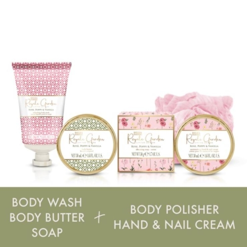- Contains 50 ml tube body wash, 50 ml jar body butter, 50 ml jar hand & nail cream, 50 g boxed soap and a body polisher