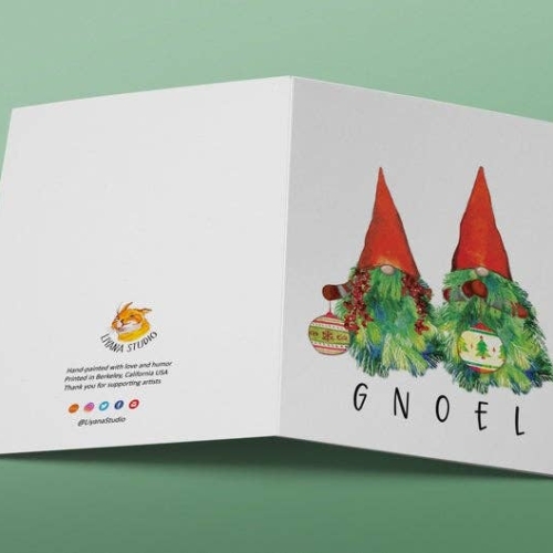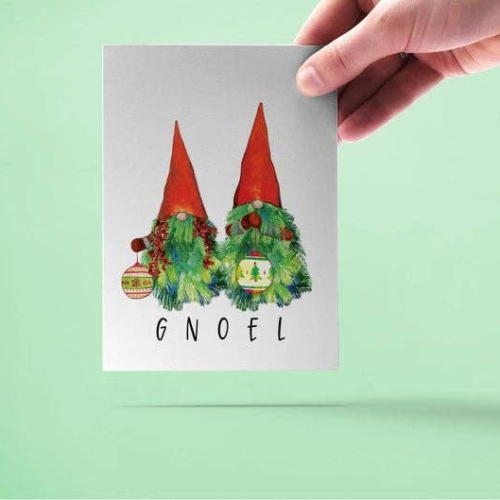 “GNOEL” —A cute Christmas card featuring a garden gnomes couple made of Xmas tree branches and a silly pun!