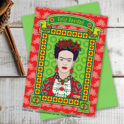 “Frida’s Christmas” Mexican artist Frida Kahlo’s 5×7 blank greeting card celebrates Christmas. In the colors of Christmas, red and green, she wishes you “Feliz Navidad”…Merry Christmas. Her life was as colorful as her art. A horrific bus accident as a young woman put her in chronic pain. Her tumultuous marriage to controversial Mexican artist, Diego Rivera, added to the intrigue of her story. This image frames Frida with a Mexican tile look. She poses with her legendary flowers in her hair, colorful jewelry, shawl, earrings, and unibrow.