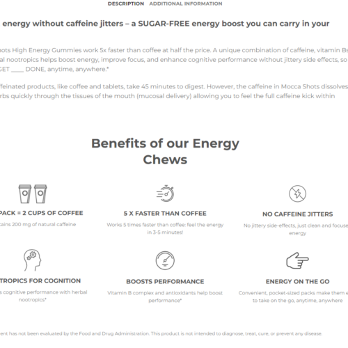 Mocca Shots High Energy Gummies work 5x faster than coffee at half the price. A unique combination of caffeine, vitamin Bs, and herbal nootropics helps boost energy, improve focus, and enhance cognitive performance without jittery side effects, so you can GET____DONE, anytime, anywhere.