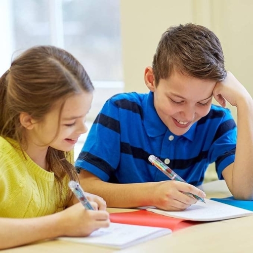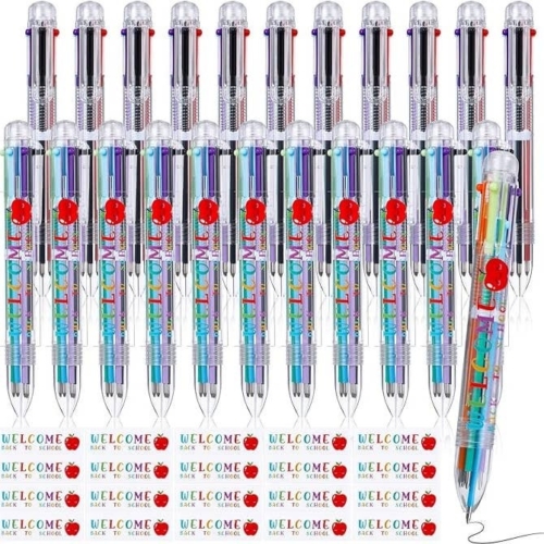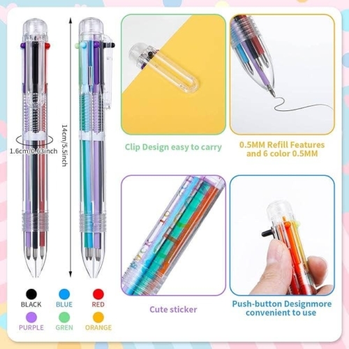 Brighten up note-taking with these 6-in-1 multicolor pens, each featuring black, blue, green, orange, red, and an extra shade for versatile writing. The fine 0.5 mm tip delivers smooth, precise lines—perfect for students, teachers, or professionals. With a retractable click design, switching colors is quick and convenient, making them great for highlighting, organizing, or creative projects. A transparent barrel shows ink levels, while included “Welcome Back to School” stickers add a fun, thoughtful touch for students. Ideal for school supplies, party favors, classroom rewards, or gifting, these pens are a must-have for bulk stationery needs.