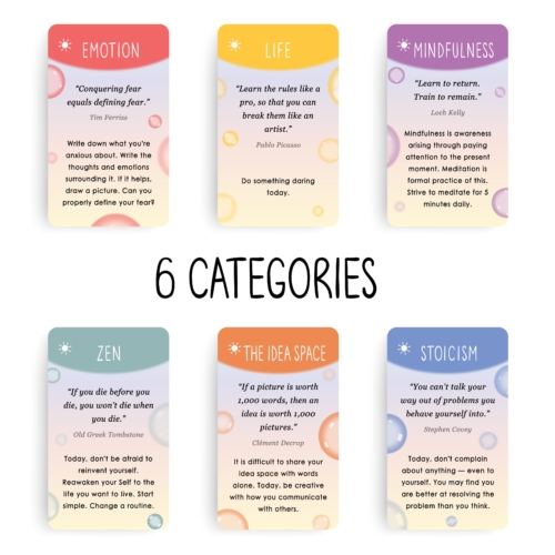Dive into our burnput-preventing prompts carefully organized into six themes: Mindfulness, Life, Emotions, Stoicism, Zen, and a new concept – The Idea Space.