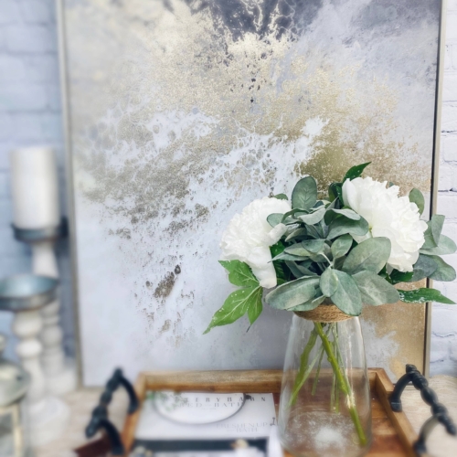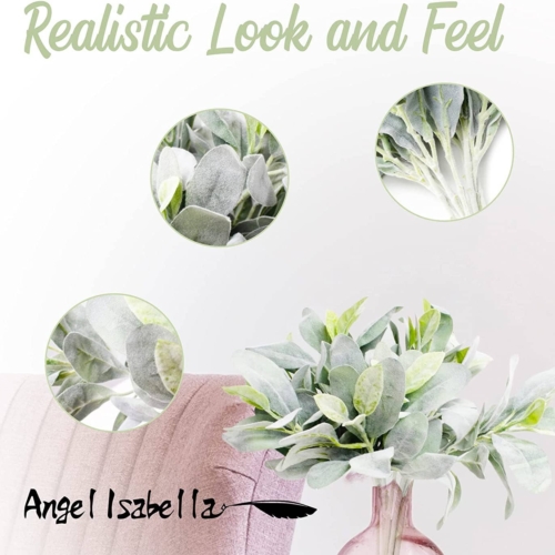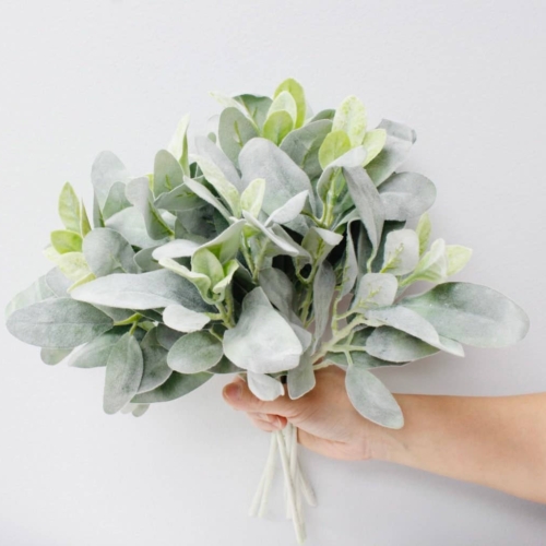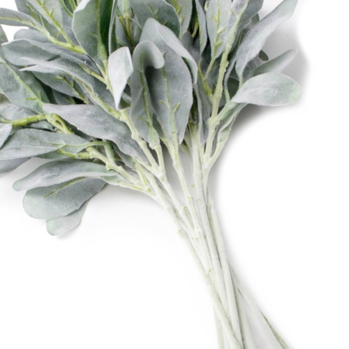 Greenery is a great way to fill out a wedding bouquet or centerpiece in a natural-looking way, and this flocked lamb’s ear is no exception. Leaves are flocked for a realistic, almost velvety feel. The flocking creates a soft, grey-green look. 14” Tall 16 Leaves, 2-4″ Long 70% Polyester, 20% Plastic, 10% Iron Wire Flocked