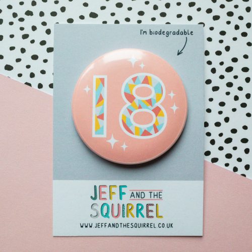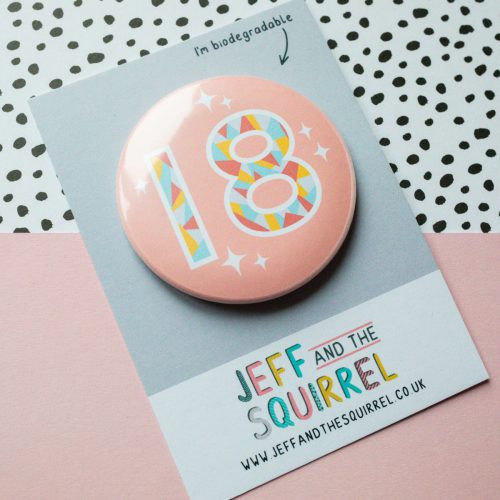 18th birthday badge in pink, with a geometric pattern
