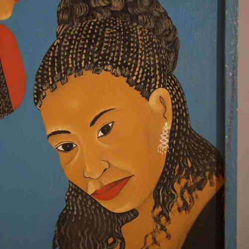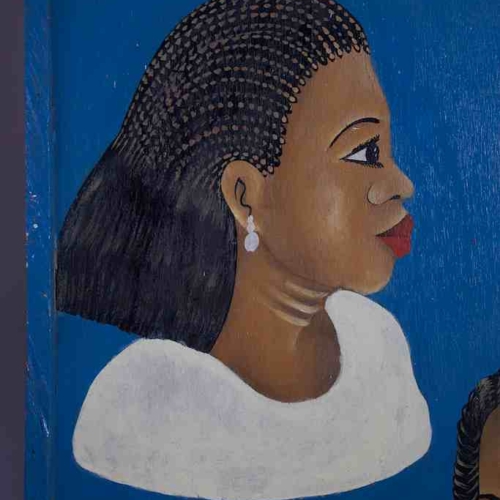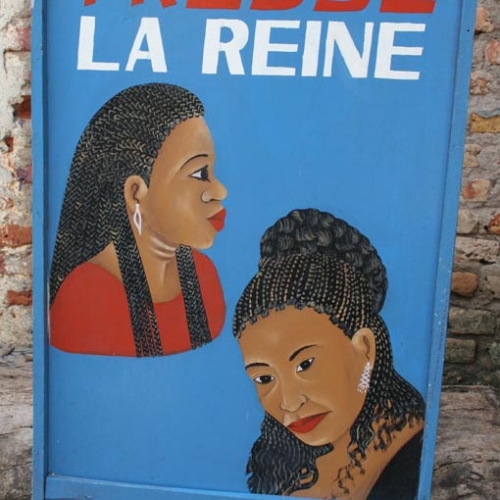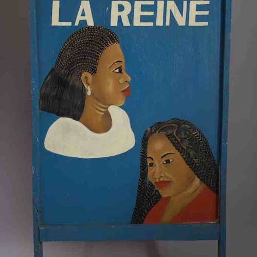 35 1/2 x 24″ (90 x 61 cm). This is one sign painted on both sides. It was mounted on a stand so that both sides would be visible from either direction. The designs on each side are similar but not the same. Unlike sandwich signs which are two separate units attached at the top by a hinge and displayed in the same manner this one is a single unit. Both types of signs are common, used to advertise businesses in Togo, in this case a beauty salon. This sign has been removed from the base that one time supported it on the ground in front of the stylist’s shop. These signs were painted by an accomplished, though anonymous, commercial artist. This sign is distinguised by its bold royal blue background on which two large women’s heads are beautifully painted by hand. At the top is the word, in large capital red letters, TRESSE, which means BRAIDS, in French. However the word is colloquially used in Africa to indicate that any women’s hairstyles are available in that establishment. Underneath that word, in large white capital letters, is the phrase “LA REINE”, which means “The Queen”, in French. Referring to the main image here, the woman on the top left is wearing a red top and is looking to the right from the perspective of the viewer, but to her own left. We only see the right side of her face, a side view. She is wearing one elongated white diamond shape earring in her right ear. She, like the other woman here, is wearing bright red lipstick. Her braided hair is pulled back off of her forehead and is mostly hanging down her back but there are a few strands on each side of her head extending down her front, on both sides of her body. The woman to the lower right of the painting has her head tilted forward and to her left so both of her eyes are visible but we only see her left ear in which she is wearing a long double helix shape white earring. Her braids are tied up on top of her head in a bun with a few strands dangling down on each side of her head, on the skin of her upper chest. The wording, color and orientation of the title on the other side of this sign is identical; the background is also the same royal blue. The women on this side appear to be the same women as on the other side but with different clothes and hairstyles. The one on the top left of this side is now dressed in white; her head orientation is the same as on the other side but her earring on this side is a small white drop earring. All of her hair is pulled back off her forehead and is hanging behind her head and is shorter. The other woman on this side is now dressed in red and has heavier braids falling down on both of her shoulder, covering her ears so no earrings are visible. Both women’s hairstyles show a lot of detail, a lot of texture, as African hairstyles typically do. The sign is painted on a thin piece of wood and is in very good condition; it is framed in the same royal blue and the frame continues down to form the legs. The overall height of the sign, including the legs is 44 3/4″ (113.7 cm). This form of African art is contemporary; these signs continue to be made although currently the trend seems to be to more professionally printed signs on paper which is now cheaper than hiring an artist. This, therefore, is one of the last of a dying art.