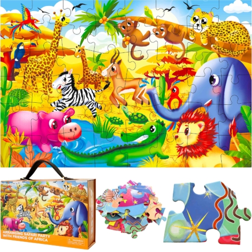 Challenging floor jigsaw puzzles for kids’ development & play by QUOKKA. Giant Floor Puzzle Africa consists of 48 large irregular pieces. With these puzzle toys for kids, you get: 🦒Giant floor puzzle Africa “Arranging Safari Party with Friends of Africa” 🎁 Premium gift box UNIQUE HIDDEN SHAPES: QUOKKA toddler puzzles have 48 large irregular pieces and unique hidden shapes; our giant animal floor puzzles are as unique as the creatures they represent; enjoy exclusive pieces for a wildly entertaining experience Size 36 x 24 inches. Designed in the U.S.A. by Adducate. Encourages hand-eye coordination, fine motor skills, memory skills, and cognitive development.