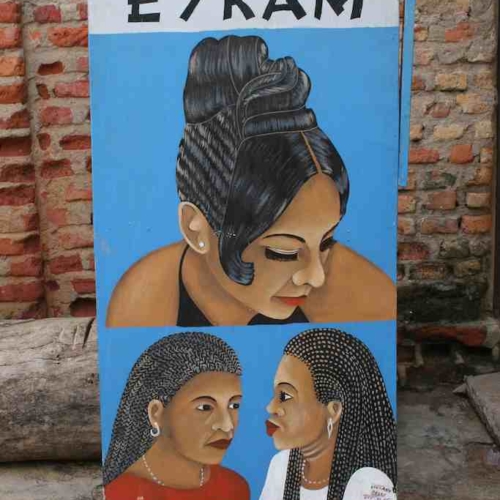 Beauty salon signs, as well as barbershop signs are common throughout Africa. Although they may exist everywhere they have reached their highest point of artistic expression in Togo, in my opinion. This sign is hinged at the top and so has another side which is also available on this site, item #639A. The sale price of each side is the same, $395 each. If both are purchased together, the complete sandwich sign, attached at the top with the original hinge, the sale price is $500. This sign measures 45 x 23 1/4″ (114 x 59 cm), 52 1/4 x 23″ with legs (133 x 58 cm). We can remove the legs if you have no use for them. In addition to enhancing their utility for you, removal of the legs will also reduce the cost of shipping them to you.