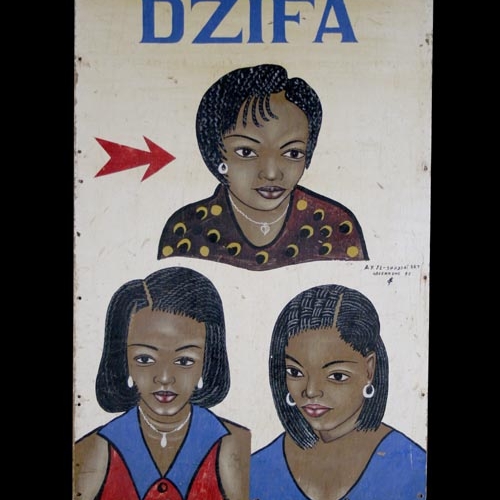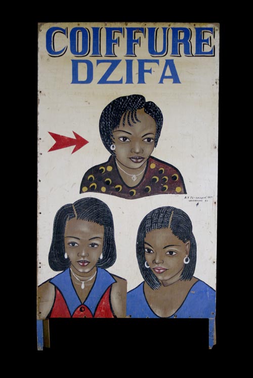 Beauty salon signs, as well as barbershop signs are common throughout Africa. This sign is hinged at the top and so has another side which is also available on this site, item #633A. The sale price of each side is the same, $200. If both are purchased together, the complete sandwich sign, attached at the top with the original hinge, the sale price is $300. This sign measures 39 x 24″ (99 x 61 cm) 43 1/2″ tall with legs (110.5 cm). We can remove the legs if you have no use for them. In addition to enhancing their utility for you, removal of the legs will also reduce the cost of shipping them to you.