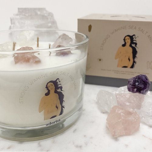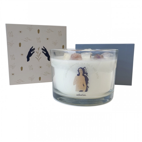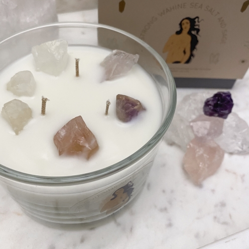 350g, three wicks, clean burn, reusable recyclable candle jar, burn time: 45+ hours with crystals, semi-precious stones and petals depending on scent nuance.