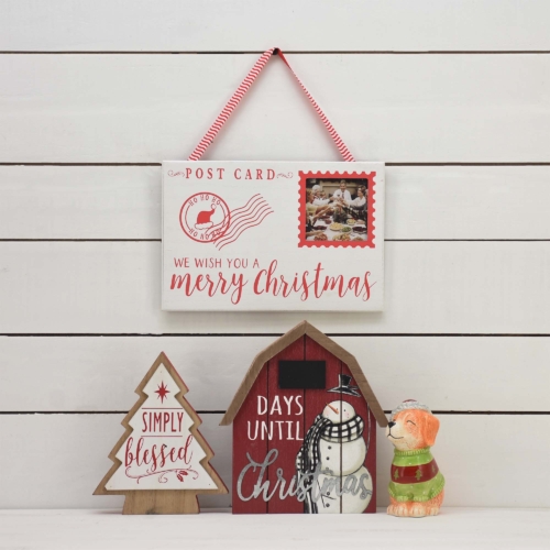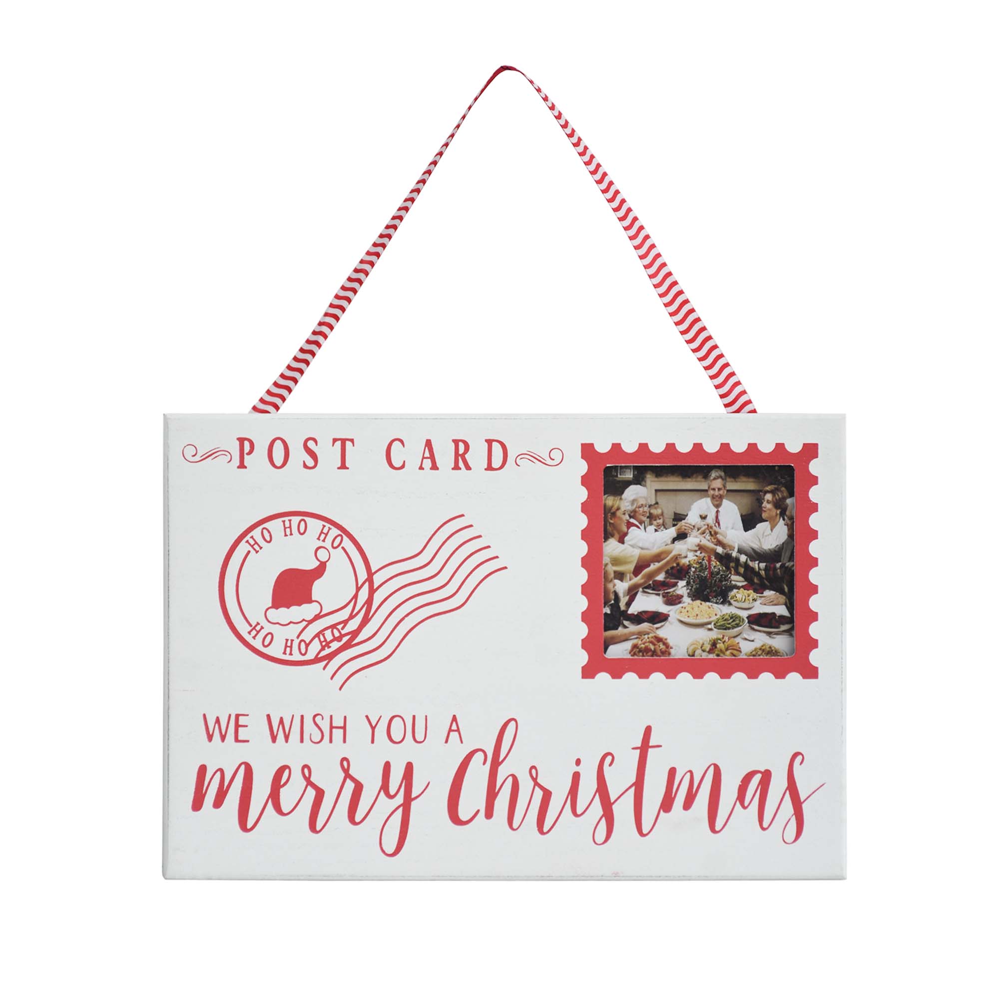 This sign pops with a white wooden background and red letters that read “post card”, “ho ho ho”, and “we wish you a Merry Christmas”.