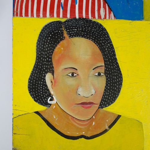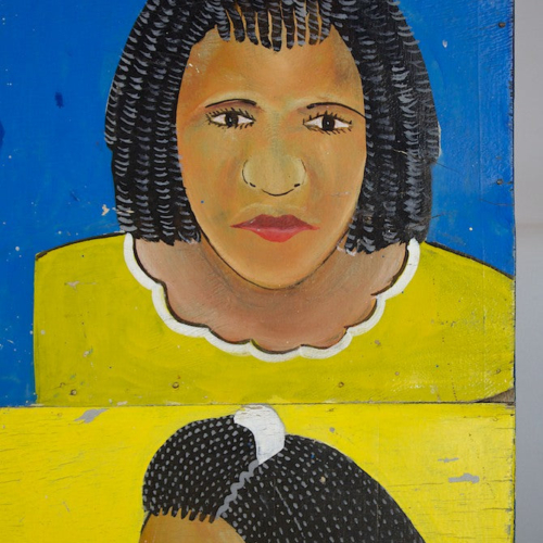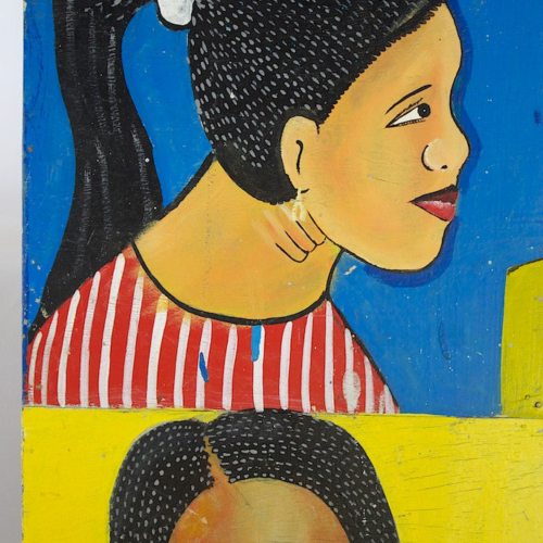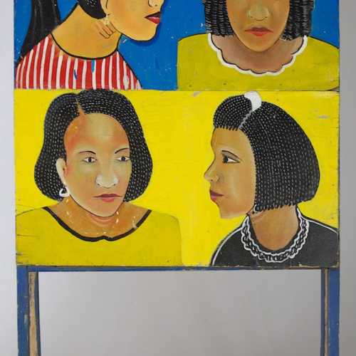 Beauty salon signs, as well as barbershop signs are common throughout Africa. Although they may exist everywhere they have reached their highest point of artistic expression in Togo, in my opinion. This sign is hinged at the top and so has another side which is also available on this site, item #627B. If both are purchased together, the complete sandwich sign, attached at the top with the original hinge, the sale price is $600. This sign measures 29 3/4 x 27 1/4″ (75.5 x 69 cm), 43 1/2″ tall, with legs (110.5 cm). We can remove the legs if you have no use for them. In addition to enhancing their utility for you, removal of the legs will also reduce the cost of shipping them to you.