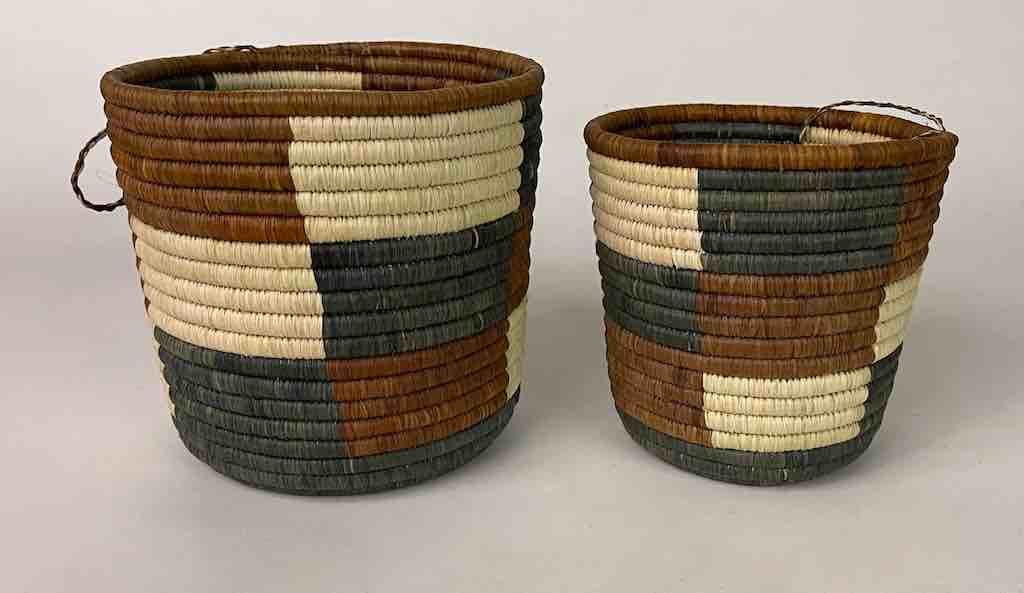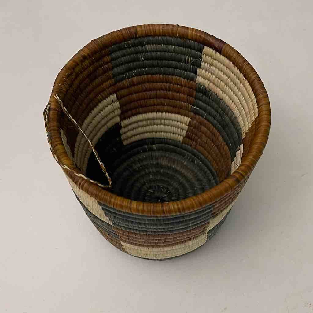 These Batwa baskets feature raffia wrapped coils in a contemporary checkerboard design. The Batwa – the Twa people, a “pygmy” people – live in the border area of southwestern Uganda, northwestern Rwanda and eastern Congo, in the area of the Ruwenzori Mountains, in the Bwindi Impenetrable Forest. They live among a native gorilla population just like we live among whitetail deer. 4 3/4” tall x 4 1/2” top diameter.