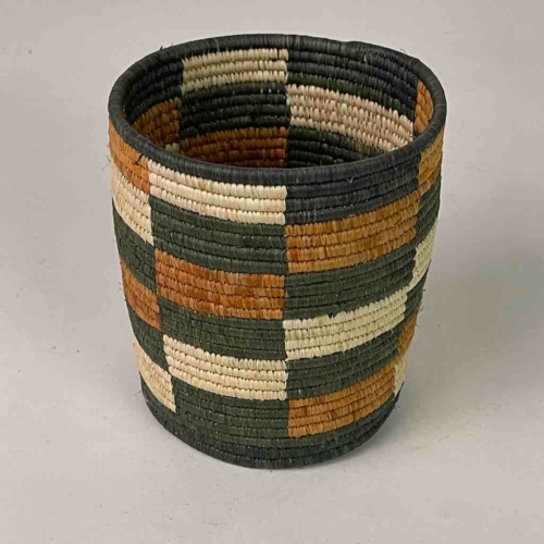 These Batwa baskets stand out among African baskets due to their exceptionally tightly woven, small coils as well as their contemporary designs. The Batwa – the Twa people, a “pygmy” people – live in the border area of southwestern Uganda, northwestern Rwanda and eastern Congo, in the area of the Ruwenzori Mountains, in the Bwindi Impenetrable Forest. They live among a native gorilla population just like we live among whitetail deer. 4 5/8” tall x 4 1/4” top diameter.