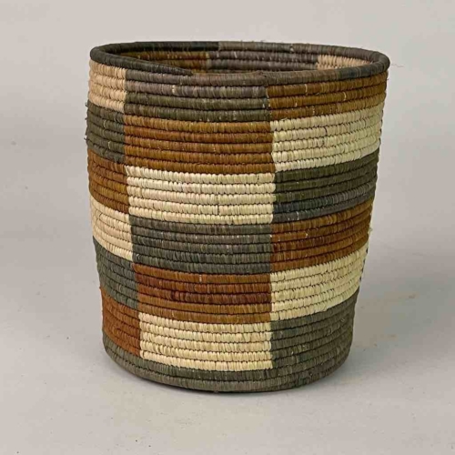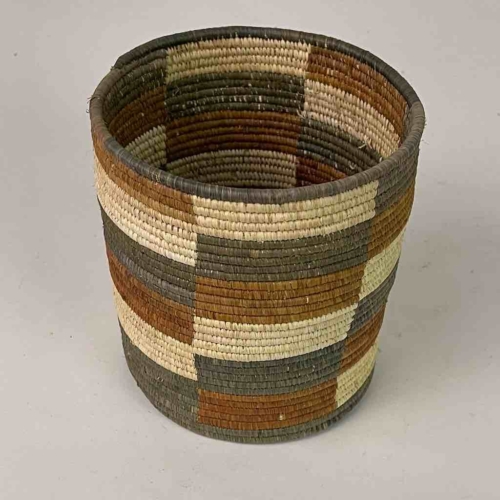 These Batwa baskets stand out among African baskets due to their exceptionally tightly woven, small coils as well as their contemporary designs. The Batwa – the Twa people, a “pygmy” people – live in the border area of southwestern Uganda, northwestern Rwanda and eastern Congo, in the area of the Ruwenzori Mountains, in the Bwindi Impenetrable Forest. They live among a native gorilla population just like we live among whitetail deer. 5 5/8” tall x 5” top diameter.