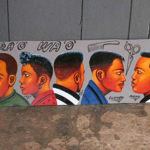 This sign was painted by the same artist in Kumasi, Ghana, as others on this page. It measures 48 x 16″ (122 x 40.6 cm). The artist had painted it and 3 others for a customer but when I offered to buy them, he agreed to paint another set for the customer who had commissioned them. Please click on the image to see 2 views of the studio where I bought them.