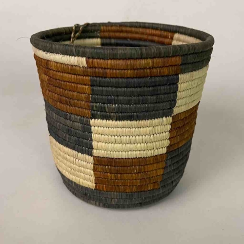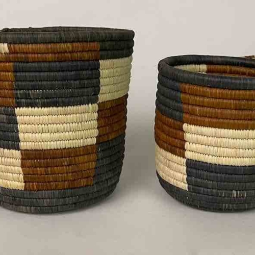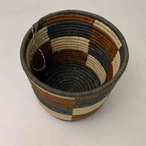 These Batwa baskets feature raffia wrapped coils in a contemporary checkerboard design. The Batwa – the Twa people, a “pygmy” people – live in the border area of southwestern Uganda, northwestern Rwanda and eastern Congo, in the area of the Ruwenzori Mountains, in the Bwindi Impenetrable Forest. They live among a native gorilla population just like we live among whitetail deer. 5 1/8” tall x 5 1/2” top diameter.