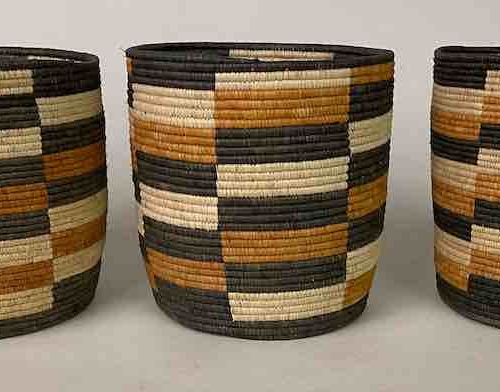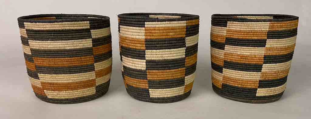 These Batwa baskets feature raffia wrapped coils in a contemporary checkerboard design. The Batwa – the Twa people, a “pygmy” people – live in the border area of southwestern Uganda, northwestern Rwanda and eastern Congo, in the area of the Ruwenzori Mountains, in the Bwindi Impenetrable Forest. They live among a native gorilla population just like we live among whitetail deer. 5 3/4” tall x 6 1/8” top diameter.