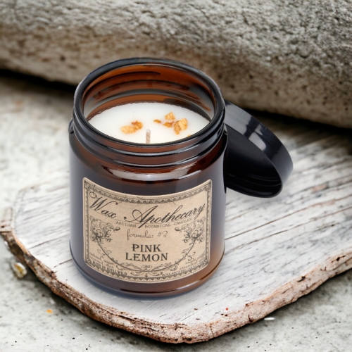 6 oz botanical candle in amber glass jar with lid. Lemon has a vibrant, zesty aroma characterized by its citrusy, fresh, and tangy notes. It evokes a sense of cleanliness, energy, and a refreshing burst of sunshine. Lemon Aromatherapy Notes: uplifting, refreshing, detoxifying, cheering 6 oz vegan candle is handmade with 100% plant-based wax, natural fragrance derived from essential oil, & blended with dried botanicals then hand poured into an old-world style amber glass jar. Cotton wick is used for clean burning & natural white color of wax so there is no color dye is added. All of our candles are Phthalate free.2.88″ Diameter x 3.52″ Height Burn time: 35 + hours -Hand poured in Idyllwild, California