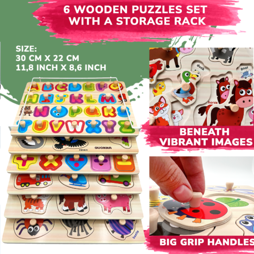 Simple educational wood puzzle games for kids’ early development & learning. Puzzles’ images are printed directly on the wood, which makes them water & scratch-resistant. With these wooden toys for kids, you get: ➀ Wooden baby puzzles – Bugs, Birds, Animals, Vehicles, ABC & Numbers in 1 set with Rack ➁ Wooden baby puzzles feature unique elements on every puzzle board. ➂ Wooden baby puzzles have lovely images and all of them are labeled for kids learning. Large jigsaw puzzle pieces are safe for toddlers 12 months & up. There are special grooves beside wood puzzle pieces to make the matching game comfortable. Easy jigsaw puzzle games for boys & girls give kids a sense of achievement. Size 11.8 x 0.4 x 8.6 inches. Designed in the U.S.A. by Adducate. Encourages hand-eye coordination, fine motor skills, and cognitive development.