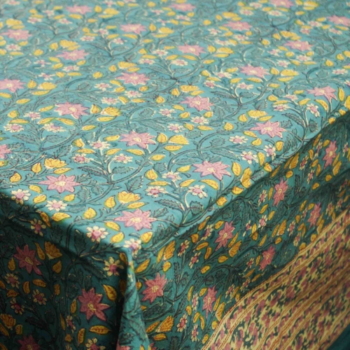 6 Seater Block Printed Rectangular Tablecloth – Turquoise Floral Jaal
