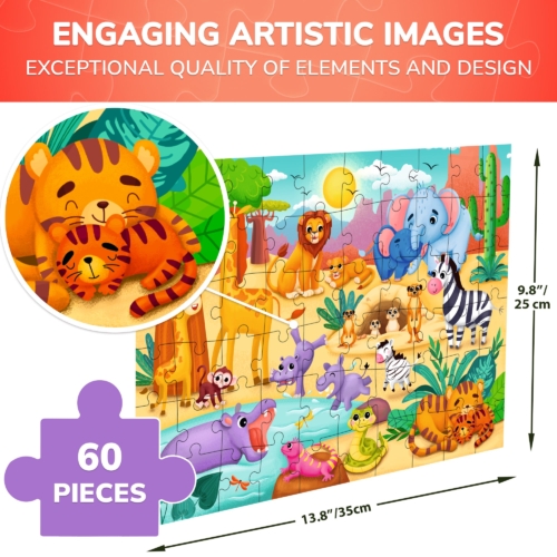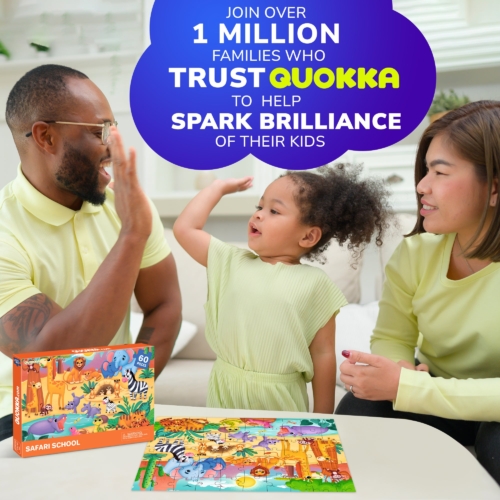 Challenging jigsaw puzzles for kids’ development & play by QUOKKA. With these puzzle toys for kids, you get: 🧩 60 large, sturdy puzzle pieces — easy for little hands; 🦁 Stunning African Animals scene; 60-piece African animal puzzle! Features lions, elephants & zebras. Large pieces for ages 3-6. Develops fine motor skills & animal recognition. FSC-certified. Size 13.8 x 9.8 inches. Designed in the U.S.A. by Adducate. Encourages hand-eye coordination, fine motor skills, memory skills, and cognitive development.