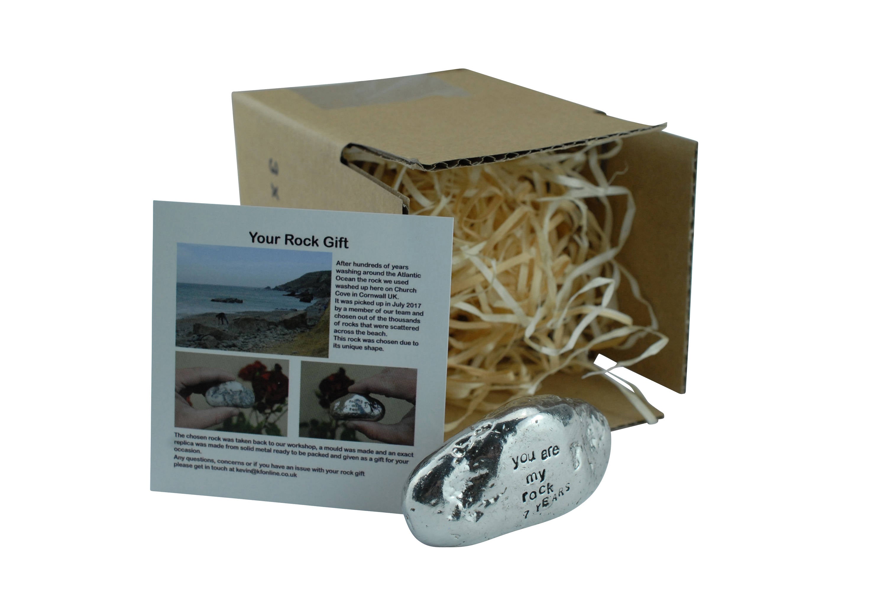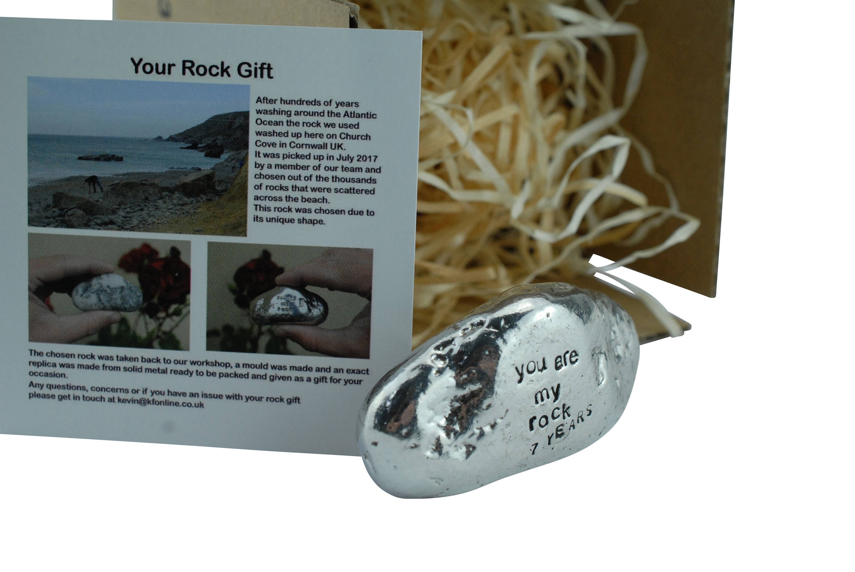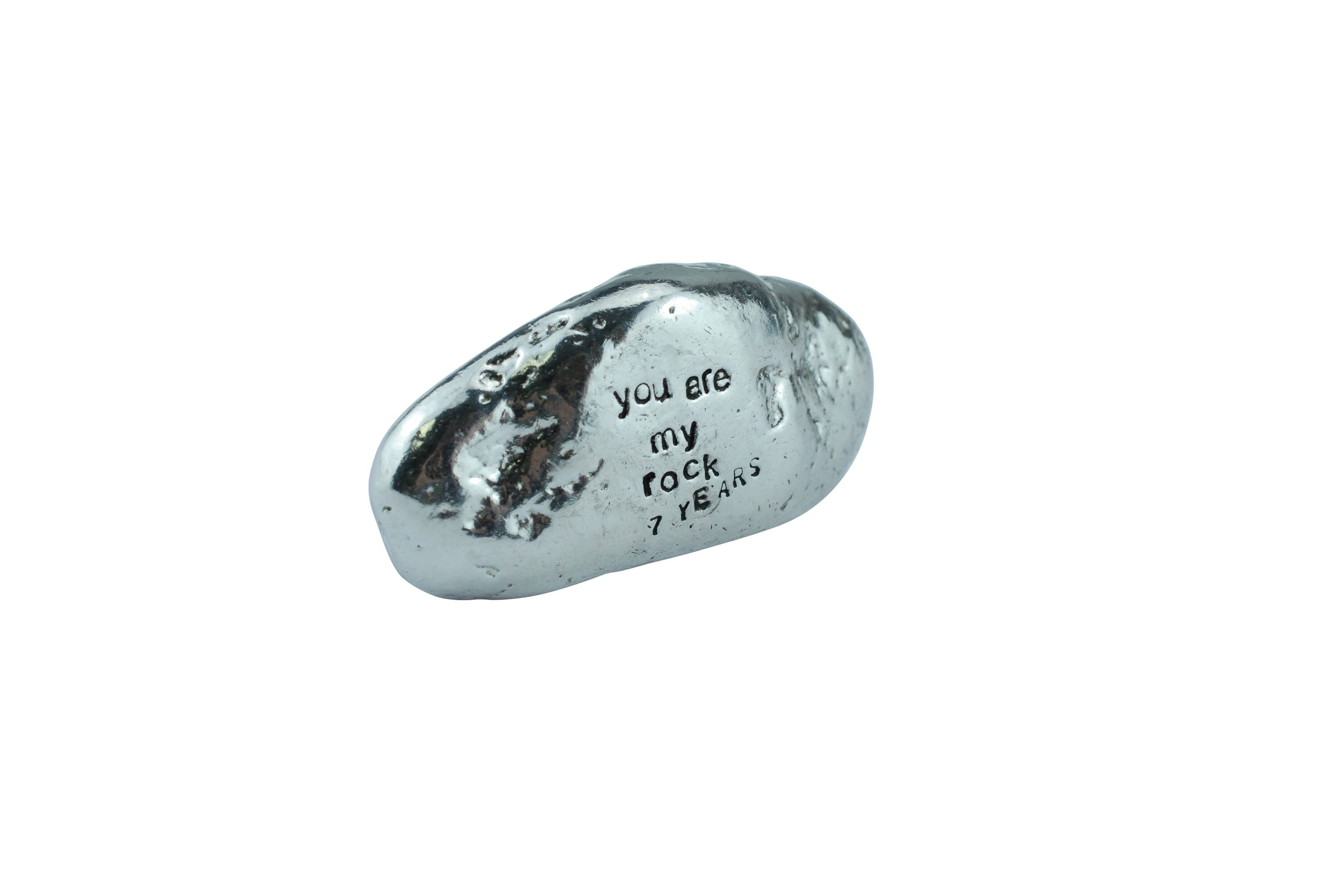This is a lovely anniversary gift idea and something unique to give your boyfriend, girlfriend, husband or wife for your 7th anniversary designed to give to someone who has been your rock for 7 year. Cast from an actual rock found on a beach in Cornwall. We created a stunning replica in solid metal, this is a heavy quality rock that would make a great ornament. Perfect for the 7th anniversary where you want to give something special and something unique you wont have seen before. Features the words ‘you are my rock 7 year’. made in the UK this item is perfect. Weight – 200g Size – 65mm x 33mm x 25mm