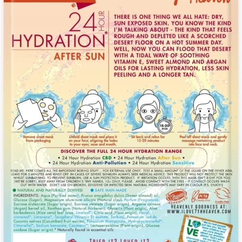 🏜️ There is one thing we all hate: Dry sun exposed skin. You know the kind I’m talking about – The kind that feels rough and depleted like a scorched desert floor on a hot summer day. Well now you can FLOOD that desert with a tidal wave of soothing Vitamin E, Sweet Almond and Argan Oils for lasting hydration, less skin peeling and a longer tan. 🔬 Clinically Proven and Dermatologically Tested 🌾 Enriched with Vitamin E 🌍 Biodegradable Bamboo Sheet Mask 🐇 PROUD TO BE CRUELTY-FREE – For over 30 years 7th Heaven (Montagne Jeunesse) has stood against animal testing and as a founding CICAW member are proud that all products are ‘Cruelty Free’ accredited and also Vegan approved by the Vegetarian Society Indications: Immediately soothing relief fron dry, sun damaged skin Ingredients: Aqua (purified water), Prunus Amygdalus dulcis (sweet almond) oil, Glucose (Sugar), Magnesium aluminium silicate (Natural clay), Parfum (Fragrance), Sucrose distearate (Sugar Origin), Sucrose Stearate (Sugar Origin), Argania Spinosa (Argan) kernel oil, Xanthan gum (Natural Thickener), Glycerin (plant Origin), Aloe barbadensis (Aloe Vera) Leaf Juice, Linalool*, Citric Acid (Plant origin), Hexyl cinnamal*, Limonene*, Tocopheryl (Vitamin E) acetate, Sorbitol, Potassium iodide, Cucumis sativus (Cucumber) Fruit extract, Potassium thiocyanate, Hydroxycitronellal*, Citronellol*, Sodium benzoate, Coumarin*, Lactoperoxidase (plant origin), Glucose oxidase (Sugar Origin). *Naturally found in essential oils Directions: Remove sheet mask from packaging, unfold sheet mask and place it on your face aligning the holes to your eyes, nose and mouth, sit back and relax for 15-20 minutes, Peel off sheet mask and gently massage remaining product into face and neck