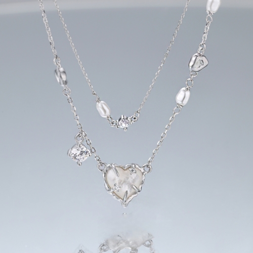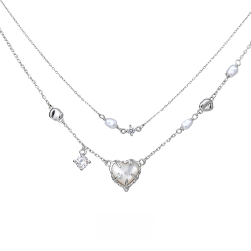A delicate harmony of textures — a heart-shaped mother-of-pearl pendant paired with scattered pearls and zircon accents on a refined layered chain.