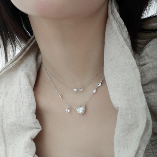 This elegant double-layer necklace features a central heart-shaped pendant crafted from lustrous mother-of-pearl, encased in organic claw-like prongs. Above it, a dainty layer of asymmetrical freshwater baroque pearls and sparkly zircon stones adds airy movement and gentle light reflection. Designed with an understated yet poetic mood, this piece brings quiet sophistication and a contemporary romantic edge — a perfect fit for modern minimalists with a taste for the ethereal.