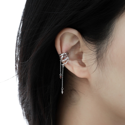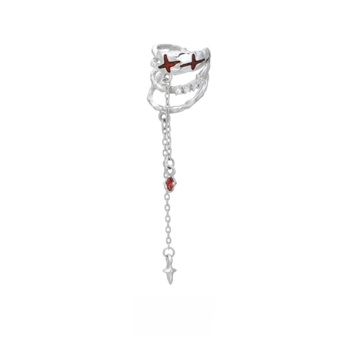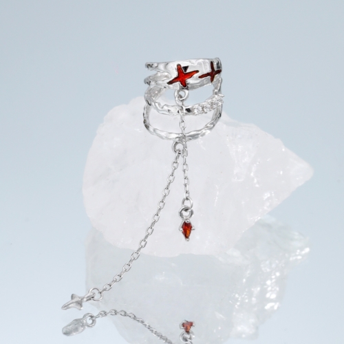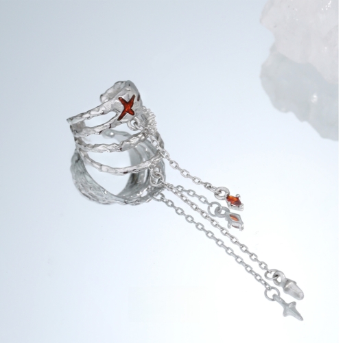 Crafted for the quietly rebellious, this asymmetrical S925 silver ear cuff features a raw, organic silhouette adorned with two red enamel four-pointed stars. Accented by a delicate drop chain with a garnet-tone resin gem and a star-shaped charm, it adds both intrigue and movement to any look — no piercing required. Designed for brands seeking standout statement jewelry with a conceptual edge.