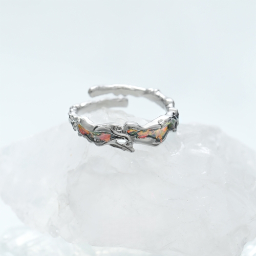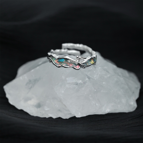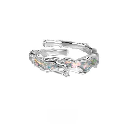 This handcrafted S925 sterling silver ring is designed with an organic, flame-like molten band that mimics the fluid dance of light. Each crevice is carefully inlaid with iridescent resin, reflecting hues of pink, green, and violet under shifting light.