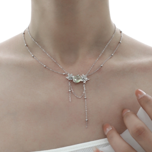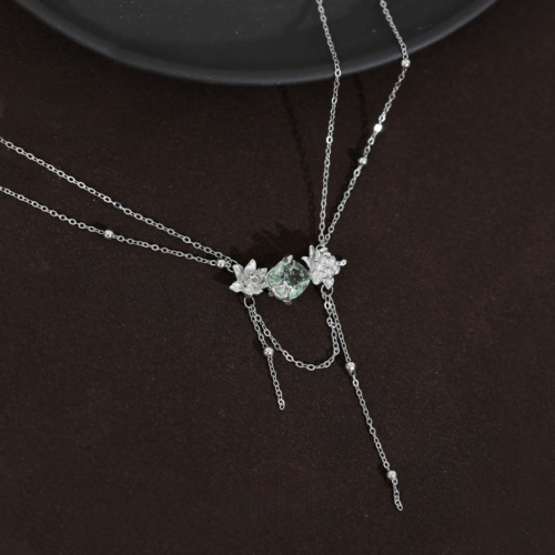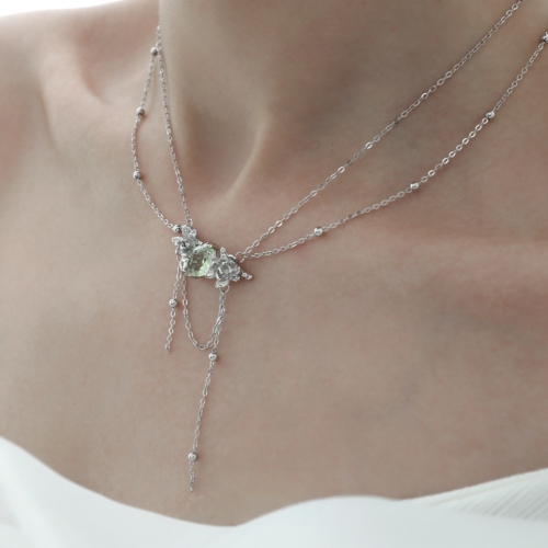 Inspired by the quiet beauty of jasmine flowers, this necklace showcases a faceted jasmine green cubic zirconia at the center, flanked by intricate silver blossoms. The piece features a double-layered chain design, with subtle bead accents and soft chain drapes that enhance its movement and sophistication. Handcrafted in 925 sterling silver, this design balances gentle color with sculptural detail—ideal for boutiques seeking poetic, nature-inspired jewelry with a refined tone.