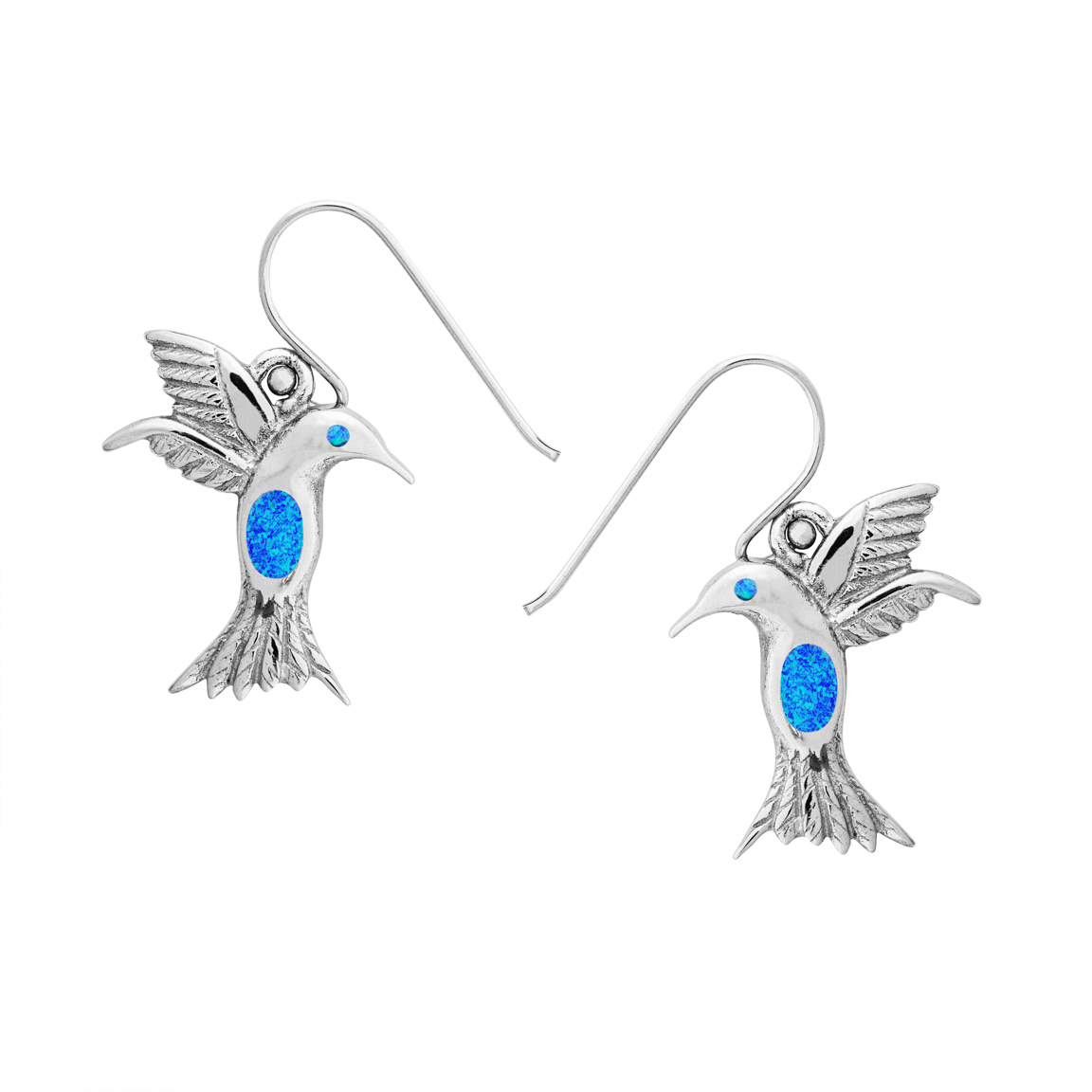 Sterling Silver Beautiful Blue Opal Hummingbird Earrings. These Blue Opal Hummingbird Earrings are Silver which is inlaid with vibrant Blue Opal on the breast & eye. They are approx 3cm including hooks. We also have matching pendants in stock.