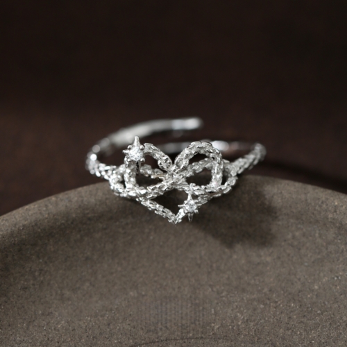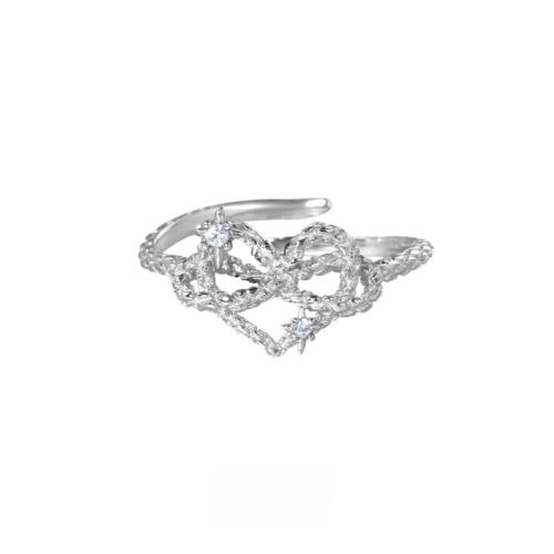 This handcrafted open ring captures a poetic contrast — the endless flow of a Mobius twist and the symbolic tension between a heart and a serpent. Sculpted in S925 sterling silver, the intricate band forms a textured heart motif, reminiscent of intertwined vines or scales, with subtle spikes and three brilliant zircon stones scattered like stars. The open design ensures adjustability while maintaining structure. Equal parts sweet and fierce, it’s a perfect statement piece for lovers of gothic romance and delicate rebellion.