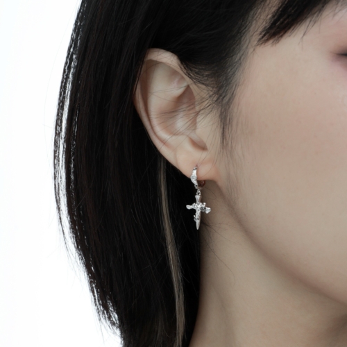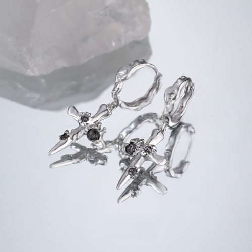These dangle earrings feature a sculptural, liquid-metal inspired cross design with irregular, organic edges—each set with black cubic zirconia stones that add depth and contrast. The earrings are crafted in solid 925 sterling silver with a softly textured finish, embodying both strength and fluidity. This bold yet wearable pair is perfect for boutiques seeking high-concept, small-batch jewelry with a quiet statement aesthetic.