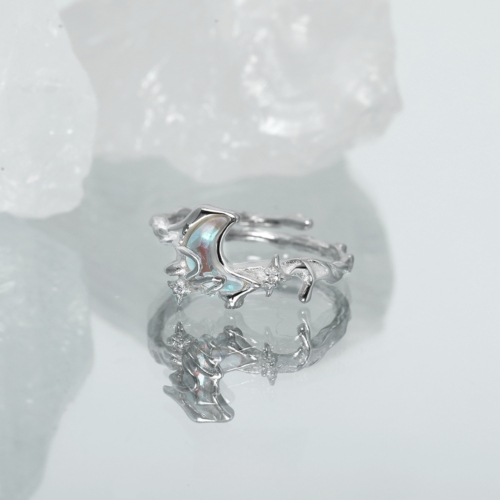 This moon ring evokes the still shimmer of the night sky. Crafted in 925 sterling silver, the irregular fluid-shaped band wraps gently around the finger like silver melted in motion. At its center lies an iridescent moon-shaped inlay, shifting hues softly in the light. Delicate star accents complete the ethereal silhouette.