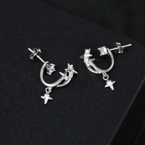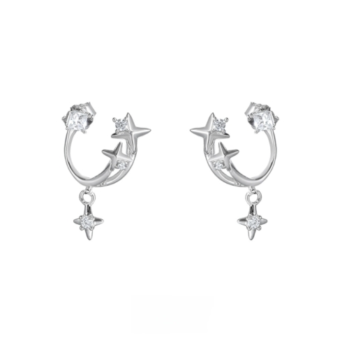 These dainty sterling silver earrings are designed to capture the fleeting beauty of a shooting star. A curved arc hugs the ear with cubic zirconia stones set like twinkling constellations, while a small dangling star adds graceful movement and light reflection.