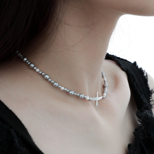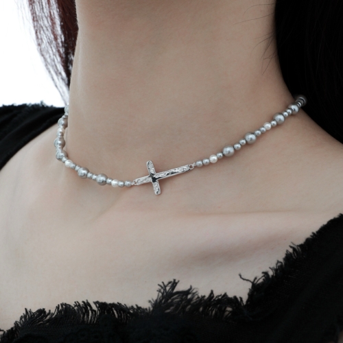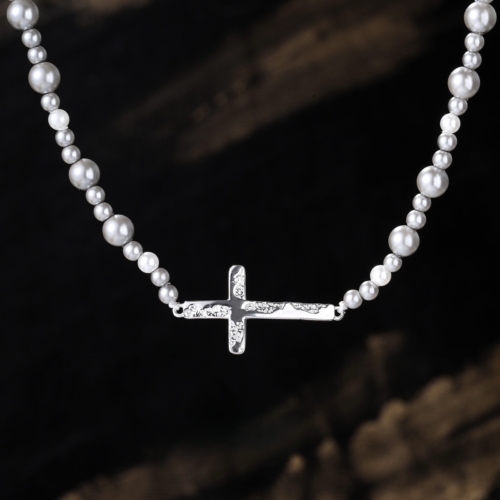 925 Sterling Silver Textured Cross & Pearl Choker Necklace