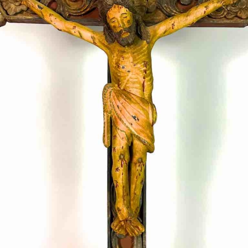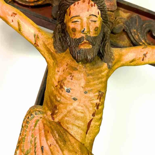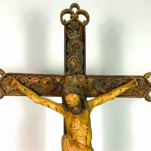 A beautiful antique item from Vietnam that reflects the Catholic presence of France in that country over 150 years ago. Since the early 1800’s France was heavily involved in Vietnam with the pretext of protecting Catholic missionaries. France continued to grow its new colony which eventually formed French Indochina in 1887. France continued to rule Vietnam as a colony until their defeat in the Indochina War which allowed Vietnam to claim independence in 1954. It is a widespread practice in Asia to have a religious shrine in one’s house: Buddhists have Buddhist shrines and Christians have Christian shrines. When a family is wealthy enough Buddhists will have a private temple in their house; Catholics a chapel. All of the ecclesiastical objects we have were component parts of such shrines/chapels. A family would de-acquisition an object only when the family believes the object no longer carries the significance it used to, when they find other objects of greater meaning or when they need the money. This crucifix measures: 46 x 23” (117 x 58 cm)