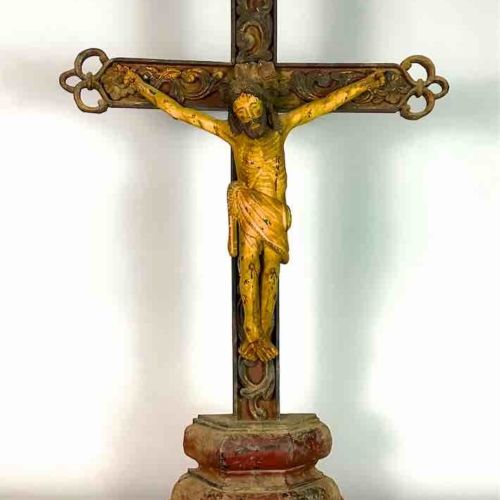A beautiful antique item from Vietnam that reflects the Catholic presence of France in that country over 150 years ago. Since the early 1800’s France was heavily involved in Vietnam with the pretext of protecting Catholic missionaries. France continued to grow its new colony which eventually formed French Indochina in 1887. France continued to rule Vietnam as a colony until their defeat in the Indochina War which allowed Vietnam to claim independence in 1954. It is a widespread practice in Asia to have a religious shrine in one’s house: Buddhists have Buddhist shrines and Christians have Christian shrines. When a family is wealthy enough Buddhists will have a private temple in their house; Catholics a chapel. All of the ecclesiastical objects we have were component parts of such shrines/chapels. A family would de-acquisition an object only when the family believes the object no longer carries the significance it used to, when they find other objects of greater meaning or when they need the money. This crucifix measures: 46 x 23” (117 x 58 cm)