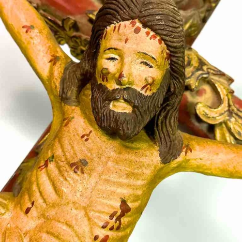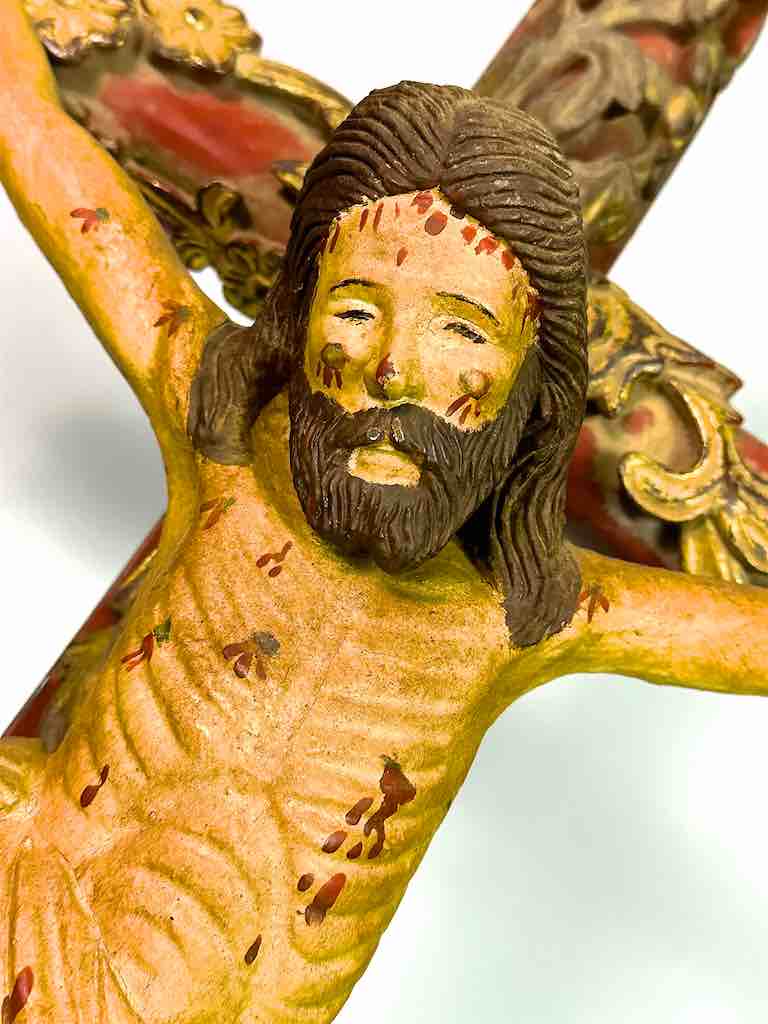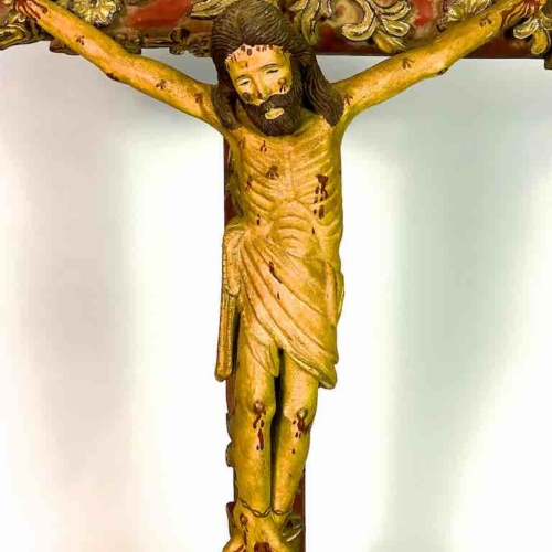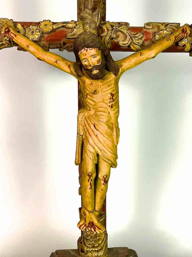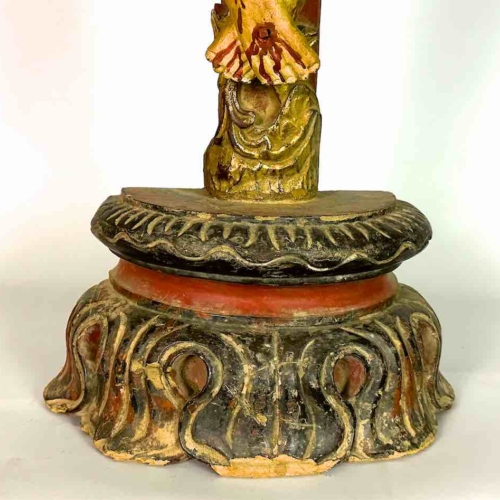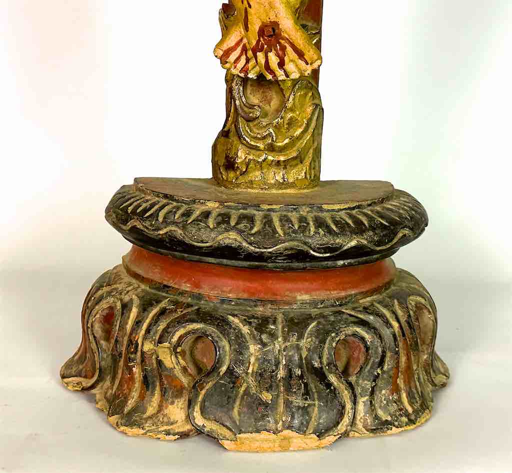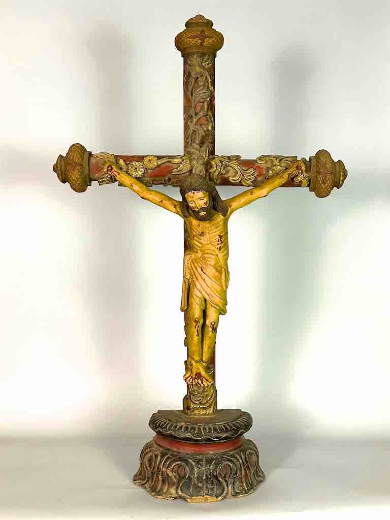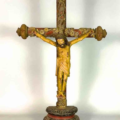 A beautiful antique item from Vietnam that reflects the Catholic presence of France in that country over 150 years ago. Since the early 1800’s France was heavily involved in Vietnam with the pretext of protecting Catholic missionaries. France continued to grow its new colony which eventually formed French Indochina in 1887. France continued to rule Vietnam as a colony until their defeat in the Indochina War which allowed Vietnam to claim independence in 1954. It is a widespread practice in Asia to have a religious shrine in one’s house: Buddhists have Buddhist shrines and Christians have Christian shrines. When a family is wealthy enough Buddhists will have a private temple in their house; Catholics a chapel. All of the ecclesiastical objects we have were component parts of such shrines/chapels. A family would de-acquisition an object only when the family believes the object no longer carries the significance it used to, when they find other objects of greater meaning or when they need the money. This crucifix measures: 43 x 23” (109 x 58 cm)