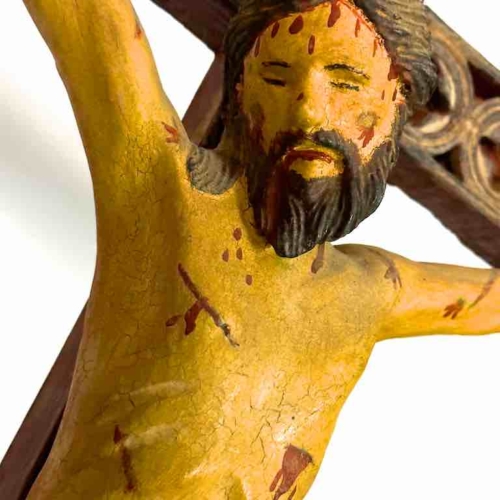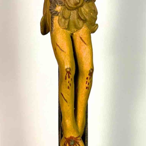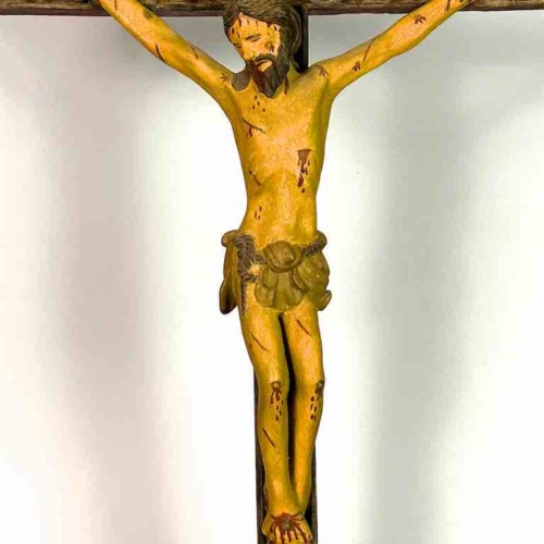 A beautiful antique item from Vietnam that reflects the Catholic presence of France in that country over 150 years ago. Since the early 1800’s France was heavily involved in Vietnam with the pretext of protecting Catholic missionaries. France continued to grow its new colony which eventually formed French Indochina in 1887. France continued to rule Vietnam as a colony until their defeat in the Indochina War which allowed Vietnam to claim independence in 1954. It is a widespread practice in Asia to have a religious shrine in one’s house: Buddhists have Buddhist shrines and Christians have Christian shrines. When a family is wealthy enough Buddhists will have a private temple in their house; Catholics a chapel. All of the ecclesiastical objects we have were component parts of such shrines/chapels. A family would de-acquisition an object only when the family believes the object no longer carries the significance it used to, when they find other objects of greater meaning or when they need the money. This crucifix measures: 43 x 24” (109 x 61 cm)