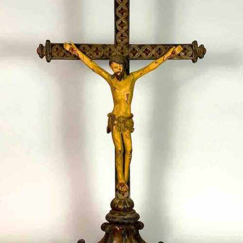 A beautiful antique item from Vietnam that reflects the Catholic presence of France in that country over 150 years ago. Since the early 1800’s France was heavily involved in Vietnam with the pretext of protecting Catholic missionaries. France continued to grow its new colony which eventually formed French Indochina in 1887. France continued to rule Vietnam as a colony until their defeat in the Indochina War which allowed Vietnam to claim independence in 1954. It is a widespread practice in Asia to have a religious shrine in one’s house: Buddhists have Buddhist shrines and Christians have Christian shrines. When a family is wealthy enough Buddhists will have a private temple in their house; Catholics a chapel. All of the ecclesiastical objects we have were component parts of such shrines/chapels. A family would de-acquisition an object only when the family believes the object no longer carries the significance it used to, when they find other objects of greater meaning or when they need the money. This crucifix measures: 43 x 24” (109 x 61 cm)