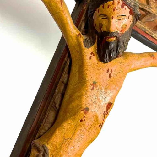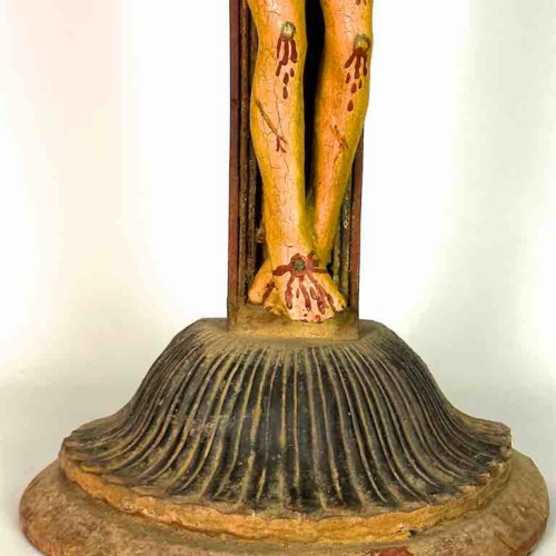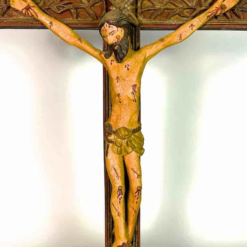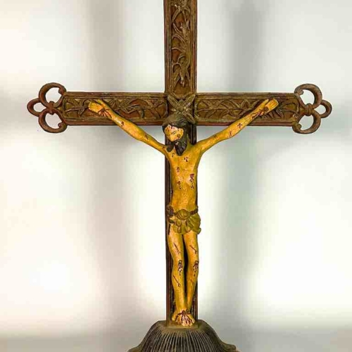 A beautiful antique item from Vietnam that reflects the Catholic presence of France in that country over 150 years ago. Since the early 1800’s France was heavily involved in Vietnam with the pretext of protecting Catholic missionaries. France continued to grow its new colony which eventually formed French Indochina in 1887. France continued to rule Vietnam as a colony until their defeat in the Indochina War which allowed Vietnam to claim independence in 1954. It is a widespread practice in Asia to have a religious shrine in one’s house: Buddhists have Buddhist shrines and Christians have Christian shrines. When a family is wealthy enough Buddhists will have a private temple in their house; Catholics a chapel. All of the ecclesiastical objects we have were component parts of such shrines/chapels. A family would de-acquisition an object only when the family believes the object no longer carries the significance it used to, when they find other objects of greater meaning or when they need the money. This crucifix measures: 39 x 28” (99 x 71 cm)