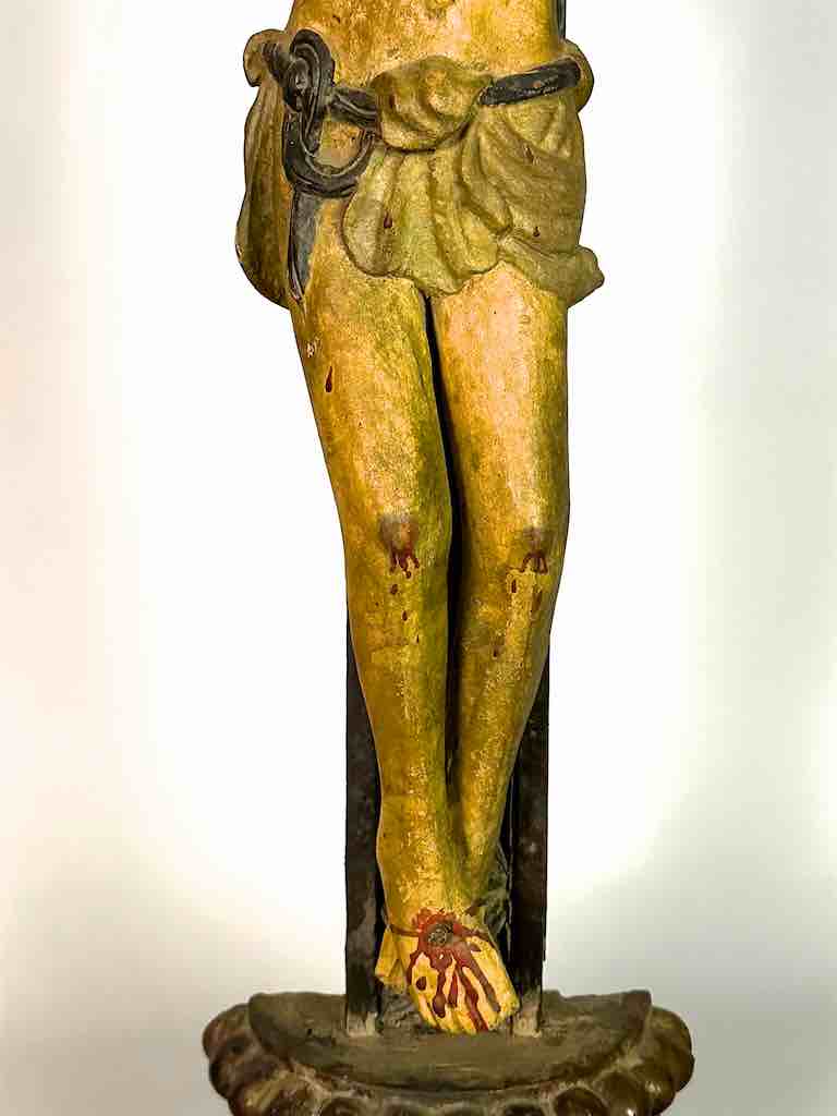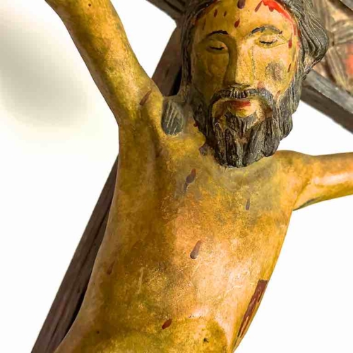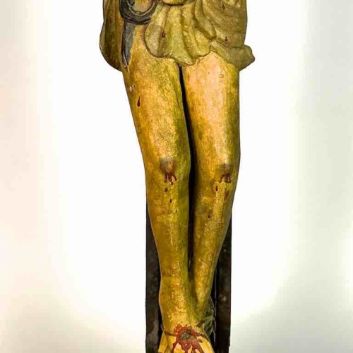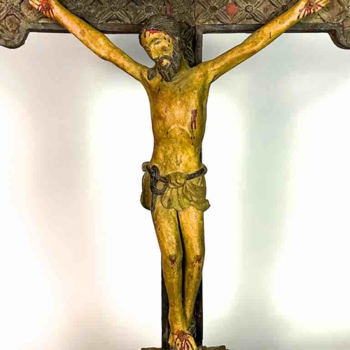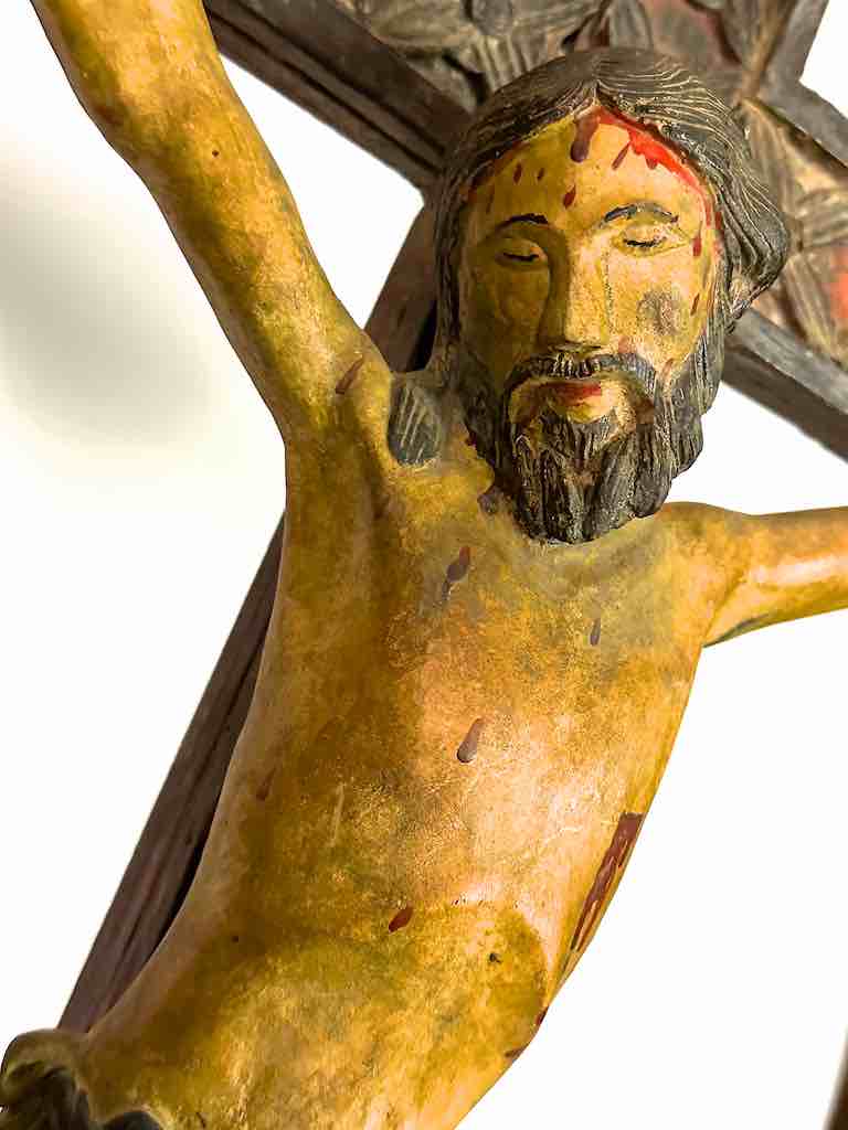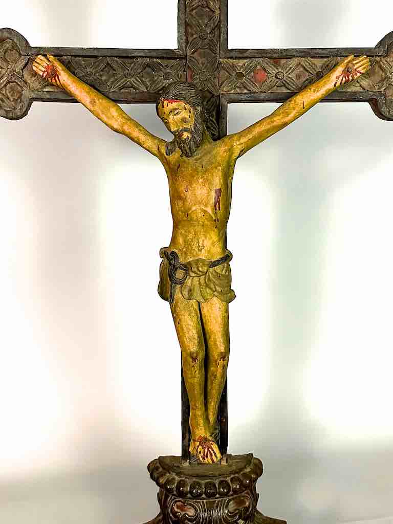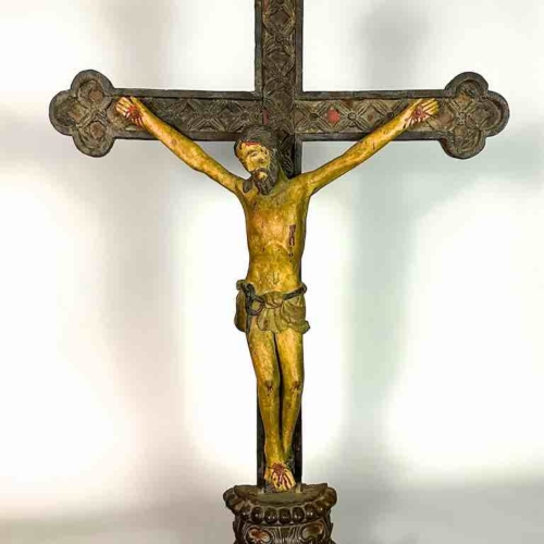 A beautiful antique item from Vietnam that reflects the Catholic presence of France in that country over 150 years ago. Since the early 1800’s France was heavily involved in Vietnam with the pretext of protecting Catholic missionaries. France continued to grow its new colony which eventually formed French Indochina in 1887. France continued to rule Vietnam as a colony until their defeat in the Indochina War which allowed Vietnam to claim independence in 1954. It is a widespread practice in Asia to have a religious shrine in one’s house: Buddhists have Buddhist shrines and Christians have Christian shrines. When a family is wealthy enough Buddhists will have a private temple in their house; Catholics a chapel. All of the ecclesiastical objects we have were component parts of such shrines/chapels. A family would de-acquisition an object only when the family believes the object no longer carries the significance it used to, when they find other objects of greater meaning or when they need the money. This crucifix measures: 37 x 25” (94 x 63.5 cm)