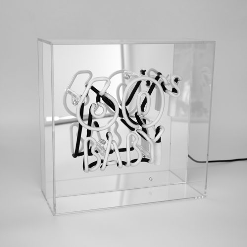 This ’60’s Baby’ neon light is available in white, encased in a beautiful glossy acrylic box with a mirror back. The perfect statement neon lighting piece for your home or unique gift for that special person.