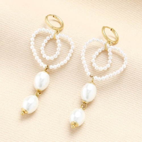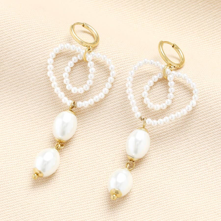 Gold-plated stainless steel earringsFeaturing a heart shape pearl and drop detailWith imitation pearls and hypoallergenic hinge closure Add to a collection of occasion jewellery and accessoriesDimensions: drop width 2.5cm x height 6.1cmhoop width 1.1cm x height 1.1cmMade from: Gold plating, stainless steel, Acrylic Pearl