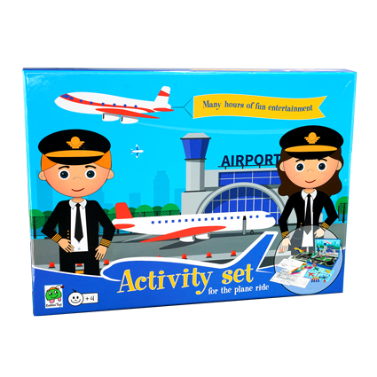 “With this activity kit designed as an airport, your child will have many playful hours, whether you are going on a flight trip or just staying at home. We have designed this entertaining activity kit that includes a memo, a ludo game, a puzzle, and even small cardboard figures so that the kids can play airport themselves. Only the sky’s the limit when it comes to playing