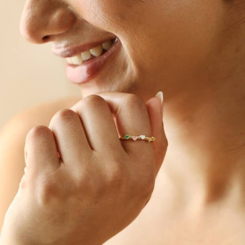 Made of 14ct gold plated brass, this stylish ring features an open back for easy adjusting. Simply pull the two ends of the ring apart to loosen, and gently push them back together again once on the finger to tighten and secure in place. The outer edge of the ring is adorned with five tiny raised love hearts, each with a glossy enamel infill in a different bright colour. DimensionsadjustableUK ring size NMade from14ct gold plated brass, enamel