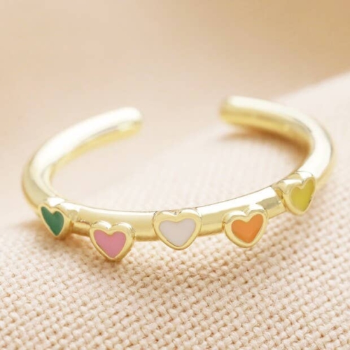 Made of 14ct gold plated brass, this stylish ring features an open back for easy adjusting. Simply pull the two ends of the ring apart to loosen, and gently push them back together again once on the finger to tighten and secure in place. The outer edge of the ring is adorned with five tiny raised love hearts, each with a glossy enamel infill in a different bright colour. DimensionsadjustableUK ring size NMade from14ct gold plated brass, enamel